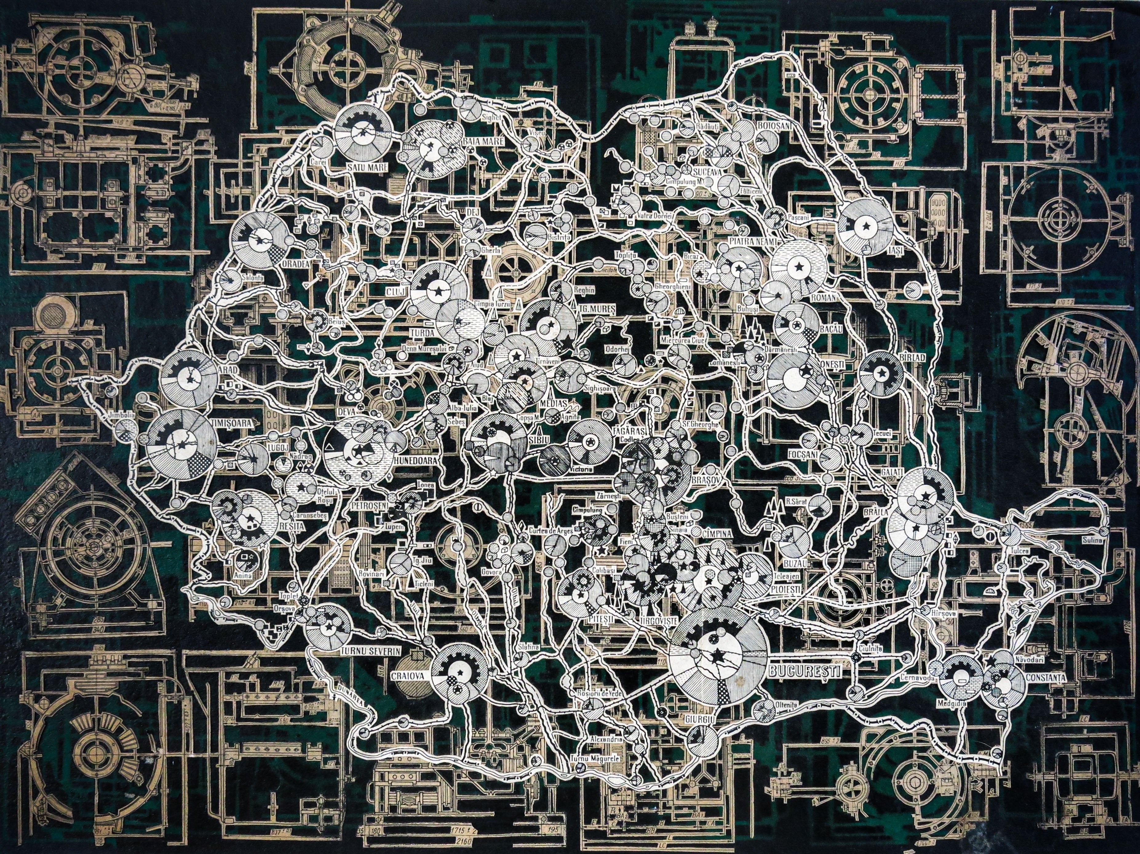 This collage uses authentic Romanian machine parts and engineering diagrams to construct a visual narrative of Romania’s industrialisation. The work critiques the negative consequences of rapid industrial growth, reflecting on lost traditions and the transformation of landscape and society.