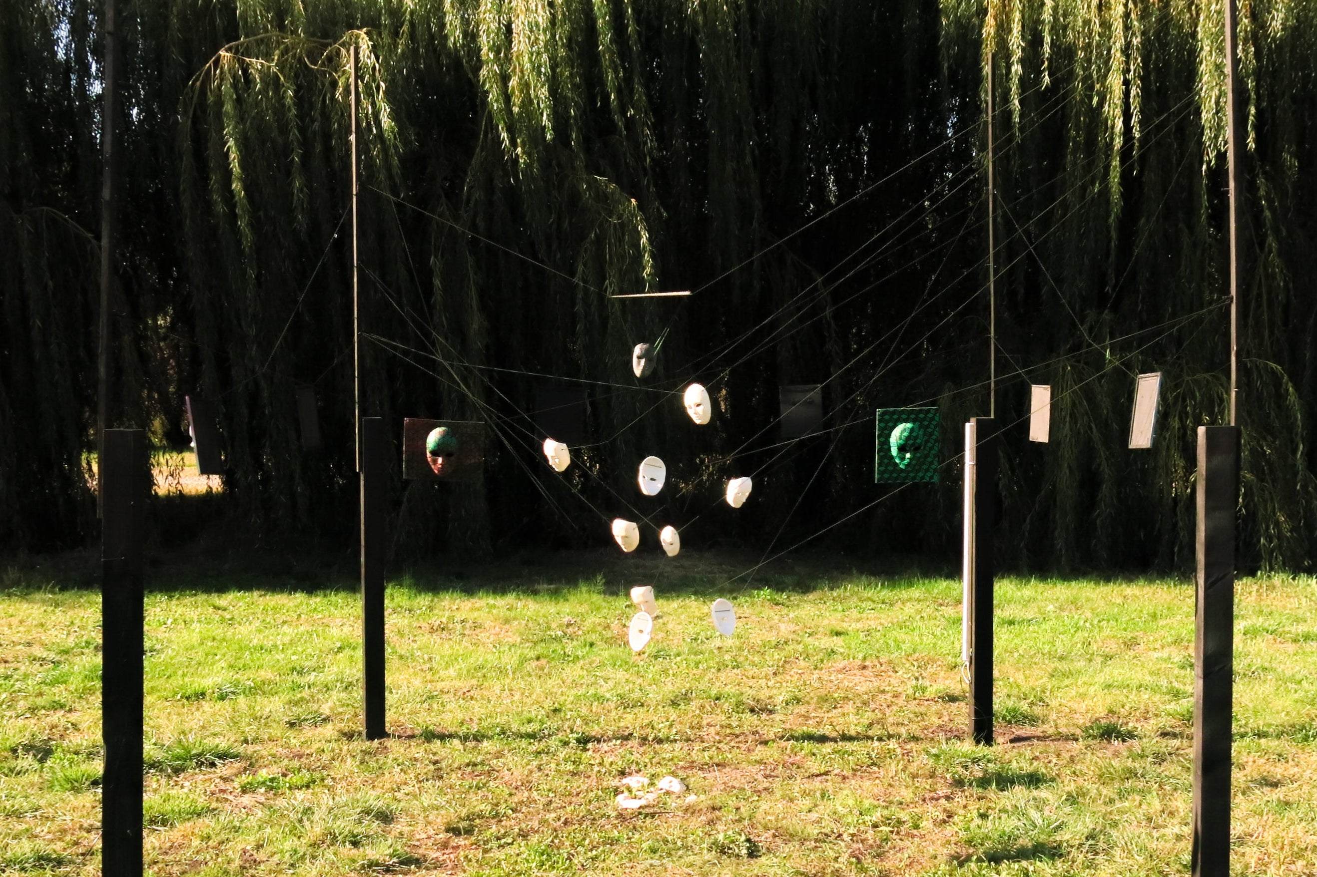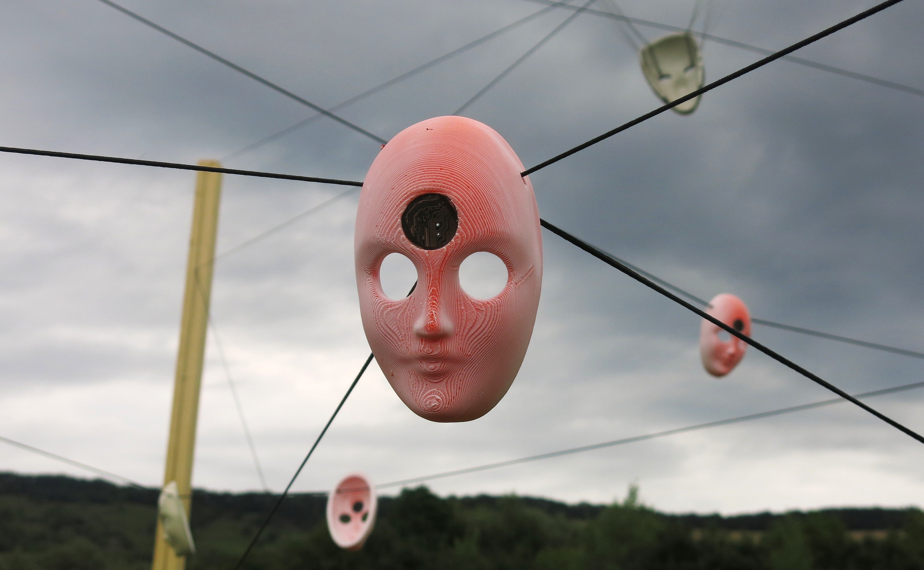 An array of masks, each with decorative circuits embedded in the forehead, mounted on a 2m² wooden frame.