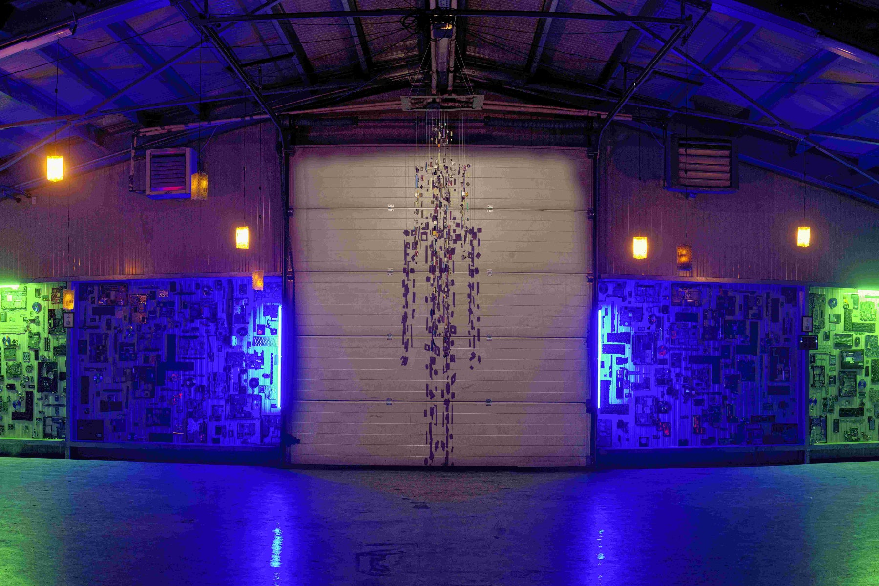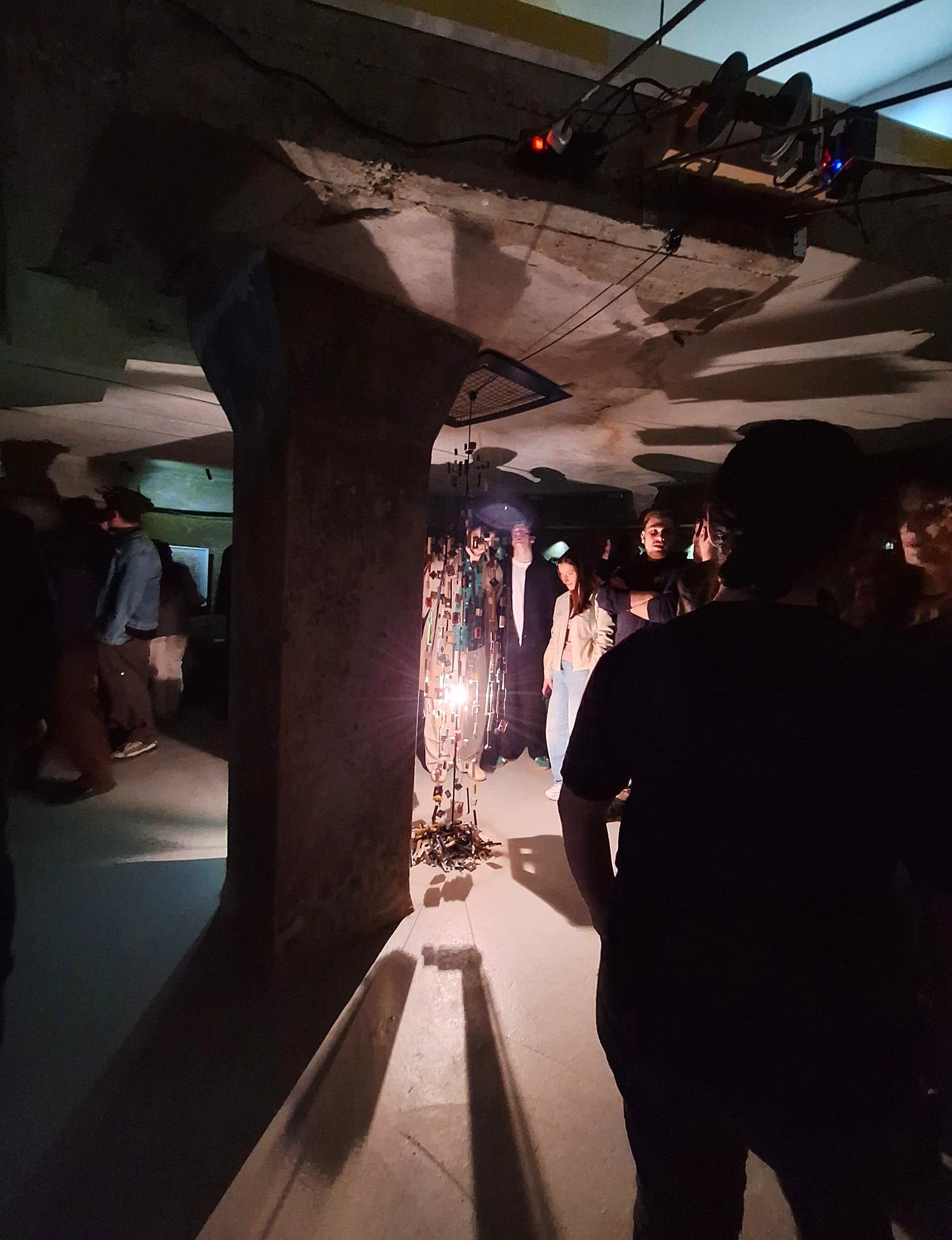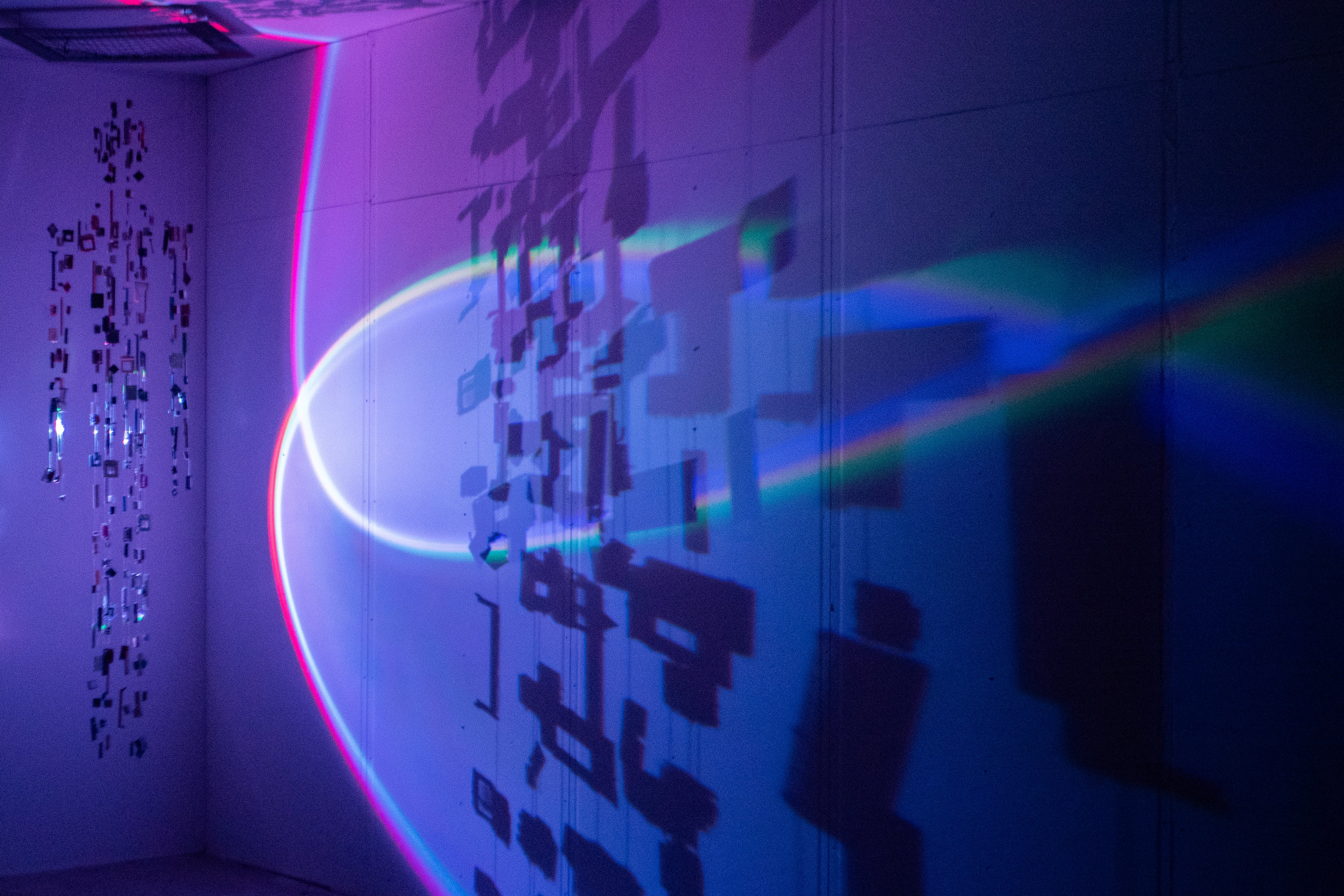 A two-meter-tall suspended human silhouette, assembled from discarded electronic connectors and plugs, is internally illuminated by a moving light. As the light travels vertically through the figure, it casts dynamic shadows of the connectors onto photographs of, industrial parts-embellished people evoking the image of engineers or digital avatars.